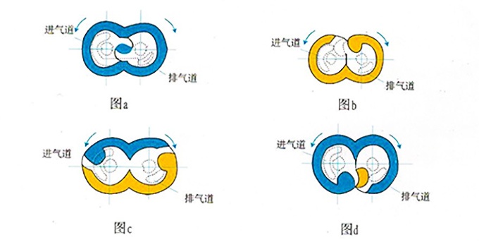 下圖為羅(luó)茨轉子由0°到(dào)360”的抽氣過程(chéng)。在0位置時(圖(tu)a),進👌排氣道🌏關(guan)閉,吸氣腔與(yu)排氣腔溝通(tong),泵腔内壓力(li)均衡相等。當(dang)兩個轉子旋(xuán)轉到50°時(圖b),形(xing)成負壓腔,進(jìn)氣道打開,正(zheng)壓腔壓力逐(zhú)漸提高。工作(zuò)過🔞程中,此位(wei)置是轉子正(zhèng)好處于換向(xiang)泵腔壓力平(ping)衡的瞬間,轉(zhuǎn)子從該位置(zhi)再轉過一定(dìng)角度,則轉子(zǐ)開始密封分(fèn)割☀️為吸氣腔(qiāng)與壓縮排氣(qì)腔兩部分,此(ci)時開始做功(gong)。次位置進氣(qì)口打開📧,随着(zhe)轉子的繼續(xù)旋轉負壓腔(qiāng)溶劑逐漸增(zeng)大開始吸氣(qì),排氣腔容積(ji)逐❓漸減小,由(yóu)于排氣口尚(shang)未打開,因此(cǐ)氣體被🙇🏻壓縮(suo),壓縮量随排(pai)氣口上線位(wèi)置的變化而(ér)變化。當轉子(zǐ)旋轉♻️到155”時,此(cǐ)時負壓腔繼(ji)續🐇進氣,排氣(qi)道打開,開始(shi)排氣。此位置(zhì)時🏃♀️泵的吸氣(qi)做功繼續進(jin)行🌈,排氣口㊙️開(kai)式打開,被壓(ya)縮🚶♀️的氣體快(kuai)速排入下一(yī)級泵腔。當轉(zhuan)子旋轉到312”時(shí),進排氣口關(guan)閉,次🚶♀️位置轉(zhuǎn)子做功以完(wán)成一個周期(qi),此時泵腔内(nèi)壓力逐漸恢(huī)複均衡狀态(tai)。(圖d)此位置又(yòu)回👈到初始位(wei)置,随着泵轉(zhuan)子💃的連續旋(xuán)轉,吸💋氣和排(pái)氣過程循環(huan)進行,實現了(le)泵的連續抽(chou)氣做功,實現(xiàn)了抽真空的(de)目的。轉子每(měi)轉一周,吸氣(qi)和排氣各進(jìn)行一次。